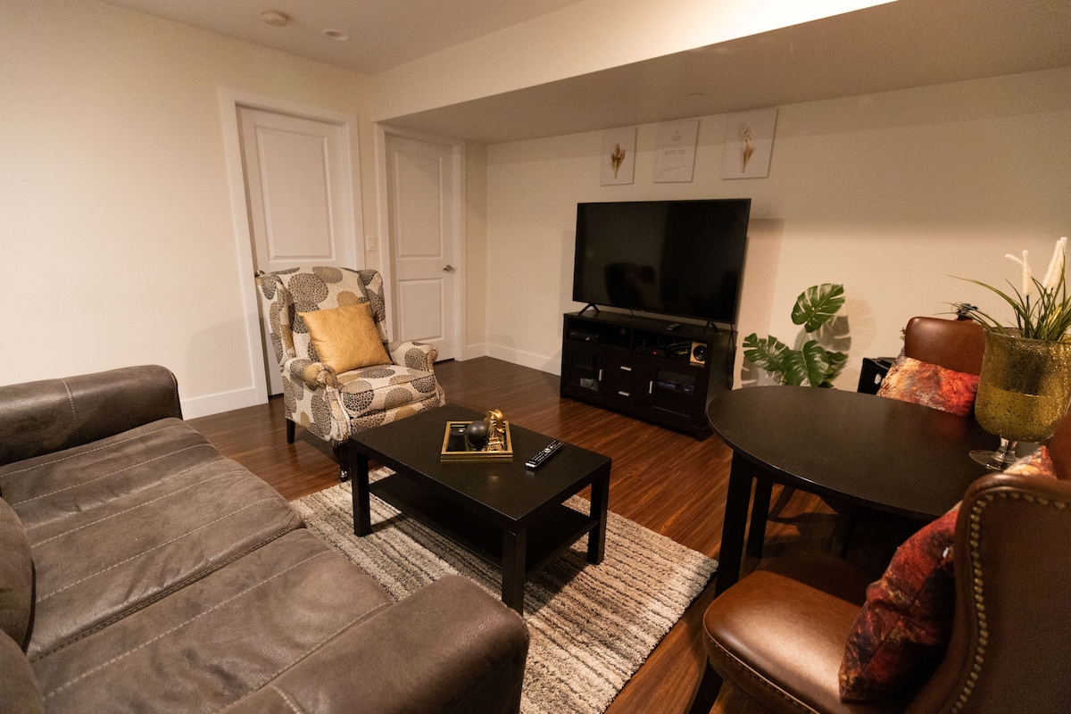 Esta suíte acolhedora e moderna acima do solo com 1 quarto e 1 banheiro é iluminada e espaçosa e oferece tudo o que você precisa para tornar sua estadia o mais confortável possível. TV de 70 polegadas com cabo e Netflix, sofá grande com cama dupla, Wifi, ar condicionado central, lavanderia na suíte, roupas de cama de qualidade com roupas de cama extras. Muitas janelas grandes que deixam entrar uma abundância de luz natural e um espaço de trabalho dedicado com vista para o quintal. Estacionamento gratuito. Pátio privativo e fumar é permitido ao ar livre.