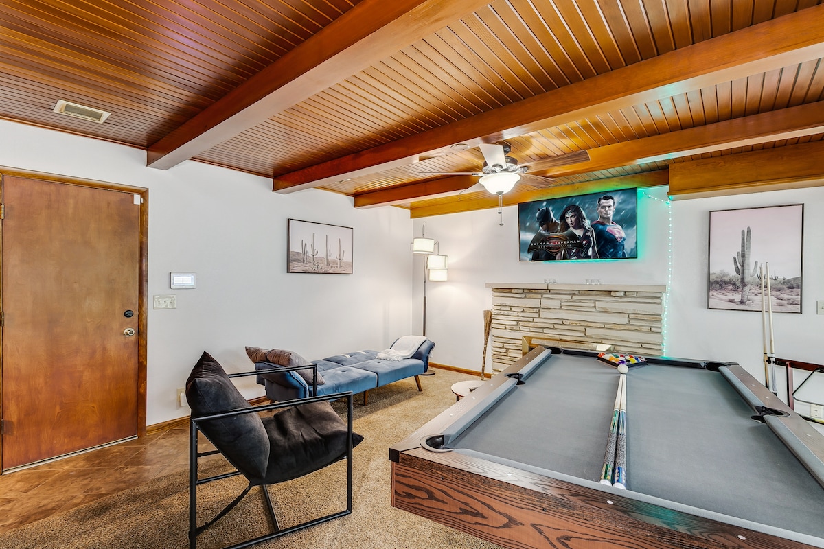 Crie memórias duradouras neste retiro único e familiar! Relaxe na banheira de hidromassagem, reúna-se à volta da lareira com os entes queridos e deixe as crianças desfrutarem de skee ball ou Galaga na sala de jogos. Convenientemente localizado em South Wichita, perto do South YMCA e Farha Center, Watson Park, South Lakes Sports Complex, Starlite Drive-In Theatre e Splash Aqua Park. Apenas a uma curta distância de carro da Intrust Arena e do centro de Wichita, com fácil acesso à Autoestrada 235 e a apenas 6 km do aeroporto.