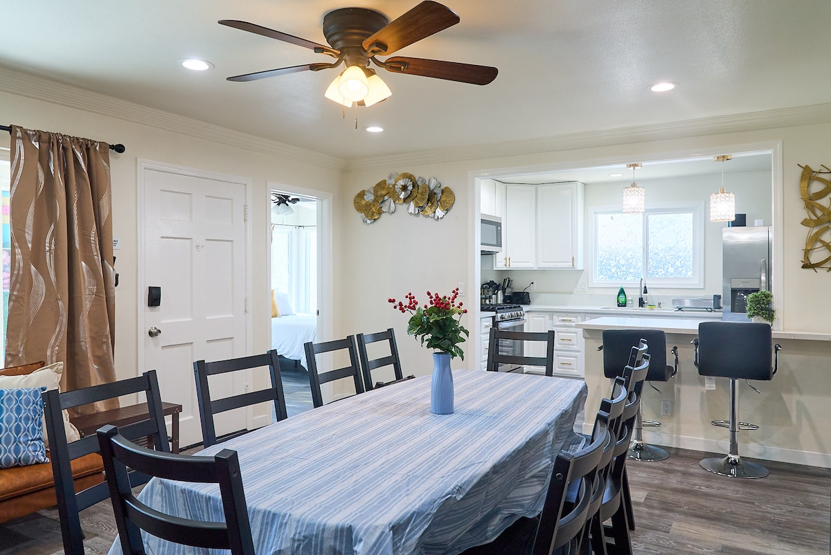 Mergulhe no sofá de couro sob uma janela panorâmica triangular de madeira e admire a arte e os tapetes coloridos que preenchem esta casa de estilo espanhol. Lá fora, dê um mergulho na piscina partilhada, relaxe no pátio ensolarado ou reúna-se à volta da fogueira. Por favor, tenha em atenção que existe uma casa de hóspedes no quintal. O quintal é uma área comum entre os hóspedes. A piscina é pequena, com apenas 3,5 pés de profundidade. Todos os hóspedes devem usar o seu critério na prática do distanciamento social. Este espaço é uma casa de estilo espanhol clássico construído em 1932, mas foi completamente renovado com tudo de novo. Estamos aninhados no coração do histórico bairro de Wrigley, em Long Beach. Uma cozinha totalmente equipada, lençóis limpos (alergénicos), toalhas, jogos e Netflix esperam por si. Encontrará café, chá, água e algumas guloseimas rotativas a flutuar. Também vai adorar a televisão LED Smart 4K de 56 polegadas. Jet para o centro da cidade, a praia, Bixby Knolls, Cal Heights ou Belmont Shore a poucos minutos. Vários restaurantes culturalmente diversos com comida fantástica e cafés incríveis espalhados pelo bairro a apenas uma curta distância de carro. - A Casa Espanhola tem uma pequena casa de hóspedes completamente independente na parte traseira do quintal chamada "The Little Bungalow", que também é um airbnb. Fora isso, toda a casa principal da frente é inteiramente sua e privada! - A piscina e a fogueira são áreas comuns, mas pode usá-las a qualquer momento. - Receberá um código de acesso temporário para a porta da frente antes da sua chegada. Por favor, note que a porta é trancada automaticamente ao sair, por isso terá de introduzir o código de acesso sempre que o fizer. Às vezes, podes ver-me a sair e a andar pelo quintal, podes vir dizer olá. Às vezes faço amigos e conversamos lá fora perto da fogueira, às vezes estou fora. No entanto, respeitarei a sua privacidade e o nosso nível de interação será orgânico. Caso tenha alguma dúvida durante a sua estadia, não hesite em enviar-me uma mensagem! A casa fica num bairro cultural e arquitetonicamente diversificado de Long Beach. As lojas e restaurantes ficam a cerca de cinco ou seis quarteirões de distância, por isso é mais fácil andar de bicicleta, de carro ou de carona partilhada em vez de caminhar até às atrações. A praia, o aquário, a Queen Mary e o centro de convenções ficam a cerca de 3 km de distância. Algumas pessoas pedalam, mas recomendo dirigir/UBER/Lyft para chegar à maioria dos lugares. 1) Há um airbnb chamado "The Little Bungalow" localizado nos fundos do quintal. Isto é totalmente separado com a sua própria entrada. 2) A Casa Espanhola tem estacionamento privado na entrada da frente. 3) O quintal principal é uma área comum, para todos os hóspedes partilharem e usarem a piscina e a lareira. 4) O cara da piscina vem no início da manhã de sexta-feira para manutenção de 15 minutos. 5) Os jardineiros vêm às quartas-feiras para manutenção de 1 hora.