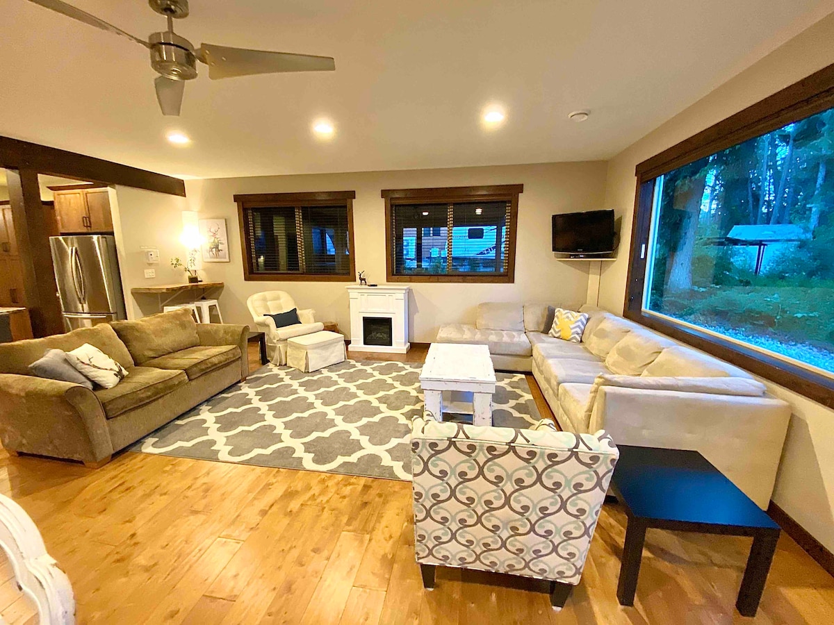 Moderno, elegante e confortável de um quarto, além de uma suíte a poucos passos da Praia de Kinsmen, perto do coração do centro de Invermere. Vistas incríveis para a montanha, ambiente relaxante, excelentes comodidades. Caminhada até ao quintal privado cercado com pátio mobilado, churrasqueira, lareira e jardins. Praia deslumbrante, alugueres de canoa/caiaque/SUP, campos de ténis, trilhos para caminhadas/ciclismo, golfe, esqui, fontes termais, refeições e compras ao seu alcance. Um espaço perfeito para relaxar e descontrair, explorar e brincar e ser você mesmo.