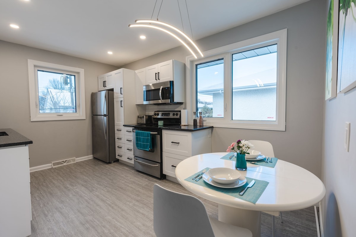 Esta espaçosa suíte de 2 quartos está localizada em um bairro seguro e tranquilo perto do perímetro, perfeito para quem dirige pelo país. Também está em rotas de ônibus, a uma curta caminhada de Sobeys, um banco e a 6 minutos de carro do famoso shopping St Vital. Sala de estar de conceito aberto lindamente projetada com lareira elétrica, área de jantar e cozinha totalmente mobiliada com ótimo espaço. Ambos os quartos têm uma cama queen-size aconchegante. 1 estacionamento disponível na entrada da garagem.