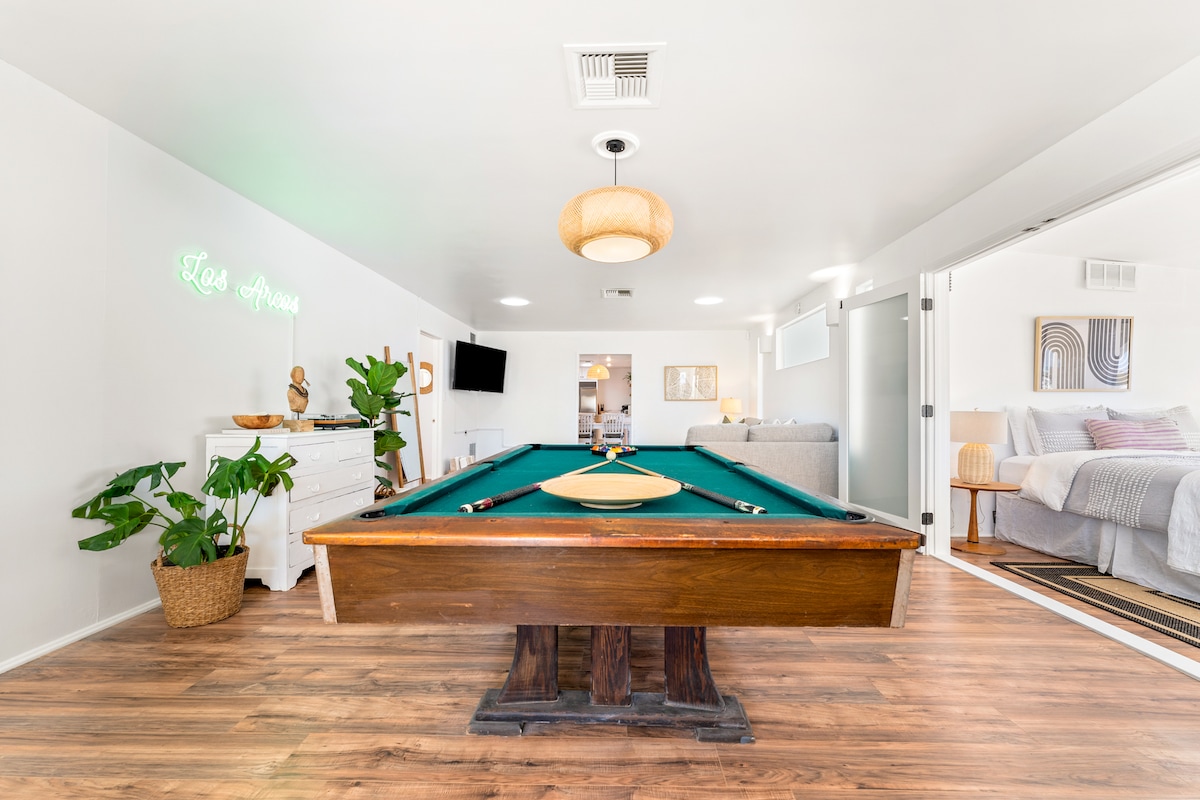 Bem-vindo ao Daybreak, uma escapadela de luxo no deserto com comodidades de alta qualidade e uma piscina de designer a poucos minutos do Parque Nacional Joshua Tree. Relaxe no quintal em estilo resort com uma piscina cintilante, spa e uma garagem de treino totalmente equipada com uma sauna seca de infravermelhos. Repleto de jogos, opções de fitness, áreas de descanso ao ar livre e espaços relaxantes para todas as idades, este refúgio moderno e impecável oferece conforto, estilo e uma escapadela no deserto verdadeiramente elevada para além do típico aluguer empoeirado.