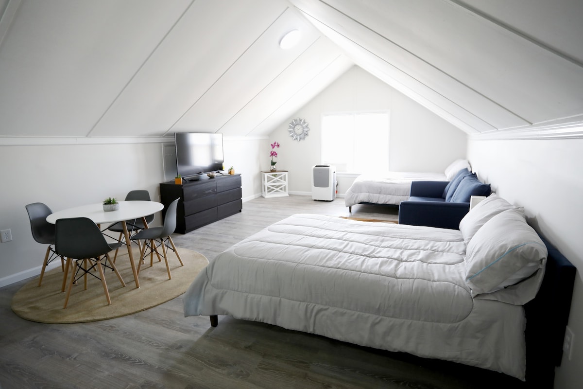 Relaxe e recarregue as energias enquanto se deleita com as vistas do campo e aproveita este espaço aconchegante. Uma entrada privada leva ao andar de cima para o loft, localizado acima do nosso celeiro reformado. Aproveite seus dias na praia, passeios de barco, pesca, observação de pássaros e muito mais. Volte para casa para ser recebido por cabras enquanto você entra na unidade. Café, chá e ovos frescos da fazenda estarão esperando por sua chegada. Centralmente localizado entre as praias de Chincoteague, Va e Ocean City, MD. Equipamento de praia também fornecido.