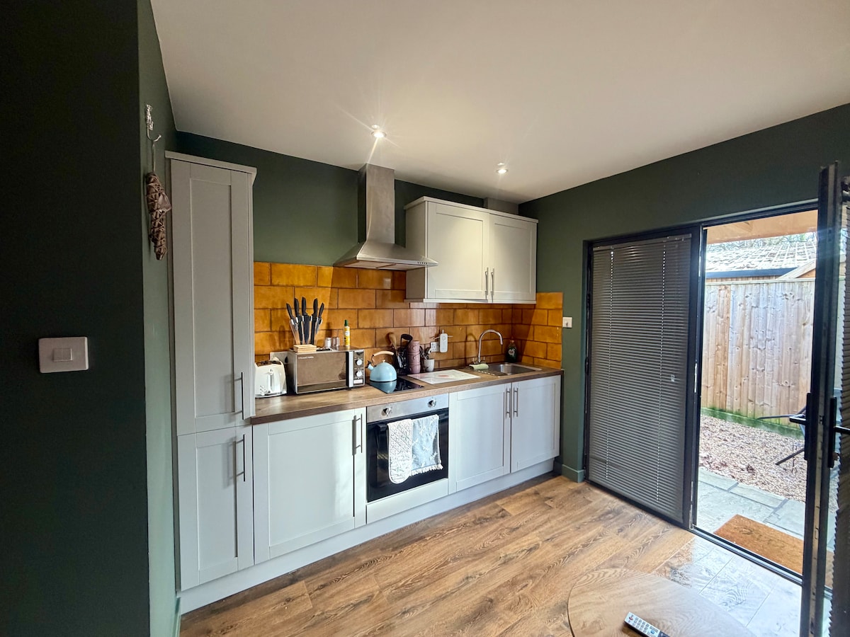 Um apartamento anexo moderno e independente com uma entrada privada que leva a uma kitchenette de bom tamanho e área de estar, com mesa, cadeiras e TV. A grande casa de banho privativa tem uma banheira de tamanho completo e chuveiro separado, enquanto o quarto tem uma cama king size, roupeiro e televisão. Há Wi-Fi de alta velocidade em todo o espaço. Do lado de fora, há uma área de pátio blindada para hóspedes com mesa de piquenique, espaço para armazenamento de bicicletas e um lugar de estacionamento (há também um ponto de carregamento de veículos elétricos para uso por acordo).
