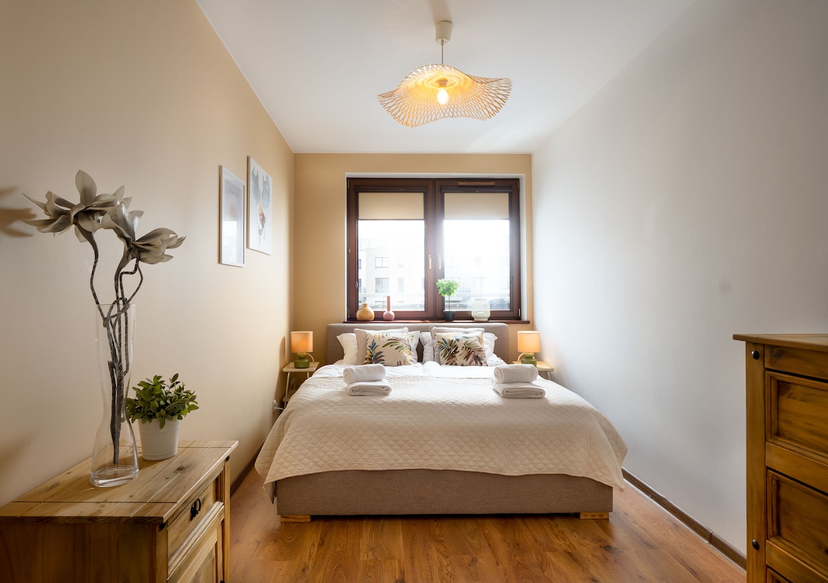 Um apartamento no centro da cidade, em um bairro tranquilo. O espaço está localizado no 5º andar de um novo edifício, pode acomodar dois hóspedes, tem um quarto com uma cama de casal, um banheiro, uma sala de estar com uma kitchenette e um grande terraço. O lugar perfeito para explorar a cidade ou viajar a negócios. É possível alugar uma vaga de estacionamento na garagem subterrânea (pago extra). O apartamento tem uma cozinha equipada, uma chaleira elétrica, um ferro de passar roupa, uma máquina de lavar roupa, toalhas limpas e lençóis.