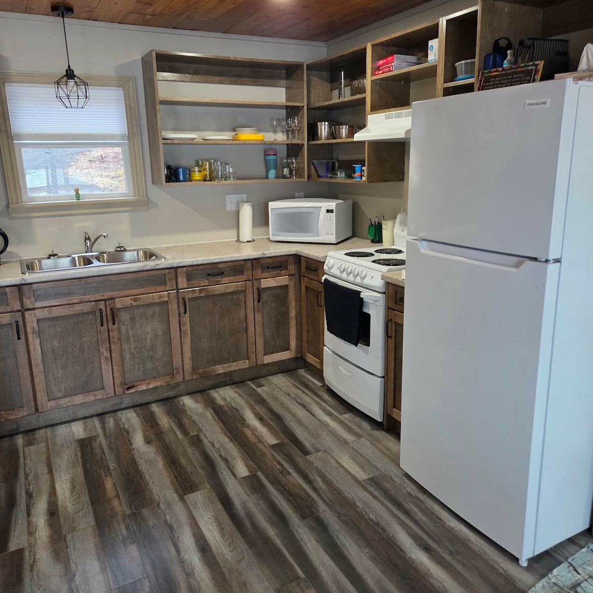 Relaxe nesta espaçosa casa de campo aquecida à beira do lago, nova em agosto de 2023. O quarto separado com cama queen, tem uma bela porta deslizante de celeiro. A área de estar principal tem um sofá-cama queen size. Desfrute de um pôr do sol deslumbrante ou de uma fogueira à beira do lago. Para o seu prazer adicional, há uma banheira de hidromassagem para seis pessoas, aninhada na floresta sob um belo gazebo - compartilhada com uma casa de campo (2 pessoas). Uso gratuito de caiaques, pranchas de remo, bicicletas de montanha, nade no lago ou desfrute de caminhadas de lazer.