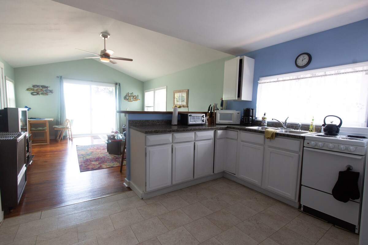Kick back and relax in this calm, stylish space. This second floor apartment boasts a newly remodeled bathroom, a full kitchen, a comfortable bedroom perfect for two & a cozy sitting area with chairs that convert into twin beds. It also offers off street parking for one vehicle & a private entrance on the deck. It's a perfect place to relax & enjoy the summer & fall. Along with our cat Taffy who will welcome you (but will not be a bother) we invite you to enjoy our home.