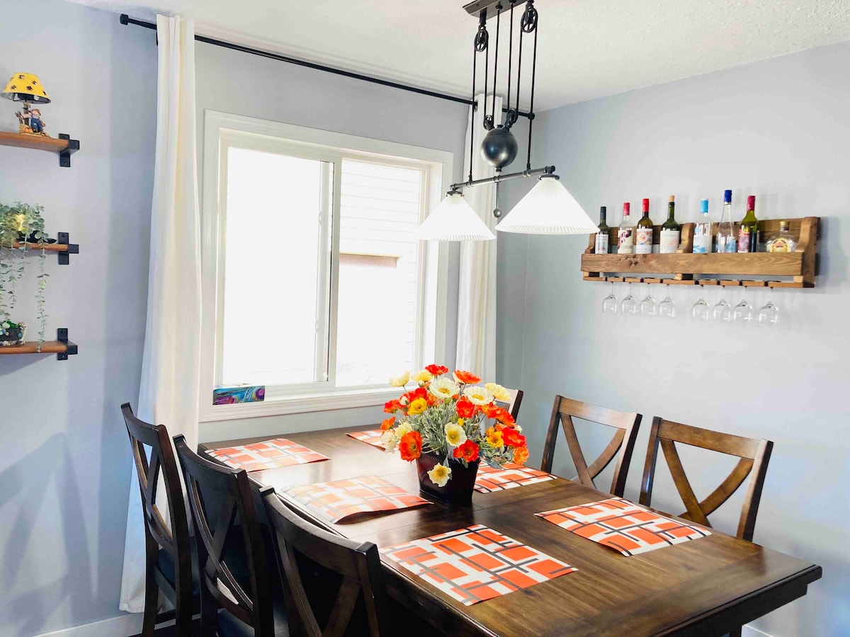 Este espaço elegante é perfeito para um pequeno grupo, é a sua casa longe de casa. Todo o último andar do bungalow com mais de 1250 pés quadrados de espaço renovado, a 20 minutos do parque nacional Jasper e a uma hora da cidade de Jasper. Serviços essenciais, como mercearias, restaurantes, etc., ficam a cerca de três minutos de carro. Cozinha totalmente abastecida com tudo o que pode precisar: Utensílios, fogão, frigorífico, máquina de lavar louça, máquina de café, máquina de café, chaleira, chaleira, micro-ondas, torradeira, espremedor, misturador, utensílios de cozinha, etc.