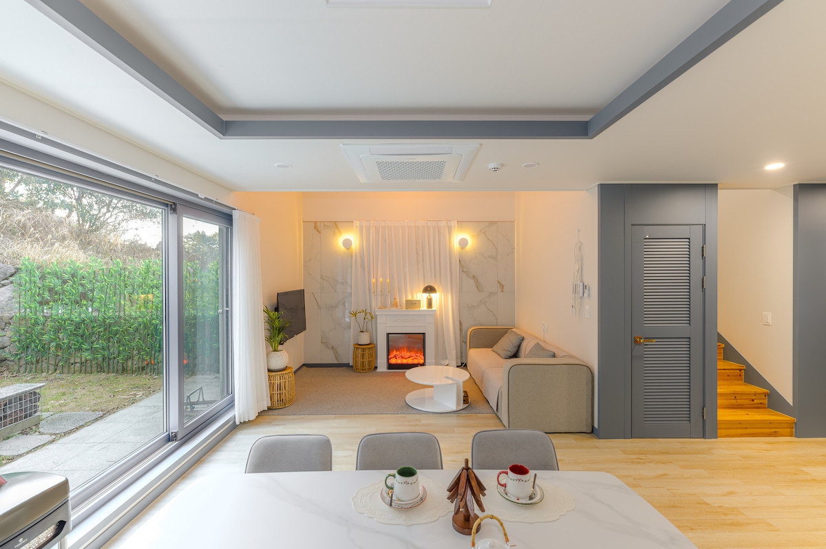 É um edifício localizado a cerca de 10 minutos de carro do aeroporto. A vizinhança em si é tranquila e calma, e o som dos pássaros e insetos é como uma música. É um lugar que me faz sentir carinho. Não há muitas comodidades, mas há restaurantes e casas de chá nas proximidades, biblioteca, centro de arte, Woljeongsa.Há o Vale de Bangseonmun, e se você se mover de carro, Nohyeong.As instalações de conveniência estão disponíveis em até 10 minutos em Yeon-dong. É também uma localização conveniente para ir para Seogwipo. Como pai de uma filha, para a segurança das mulheres viajantes, instalei câmeras de segurança e fechaduras de segurança duplas à prova de choque externo que não podem ser danificadas.