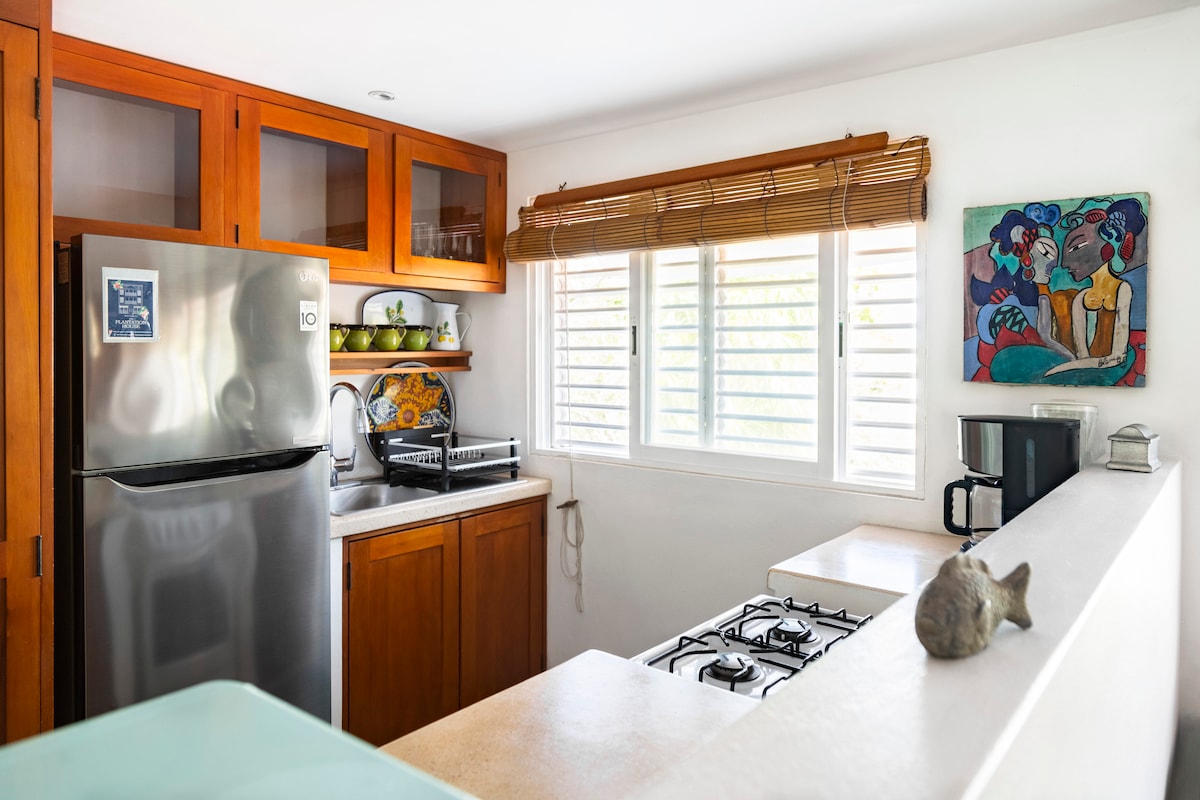 Fuja para o nosso luxuoso apartamento de 2 quartos no coração de Cozumel! Com terraços deslumbrantes, uma área de estar moderna e comodidades de alta qualidade, este apartamento é o lugar perfeito para relaxar e aproveitar a tranquilidade da ilha. Relaxe em frente à TV de tela plana, jante na elegante mesa para seis pessoas ou prepare suas próprias refeições na cozinha totalmente equipada. Nossos quartos aconchegantes dispõem de camas tamanho Queen, terraços privativos e roupas de cama luxuosas para uma noite de sono tranquila.