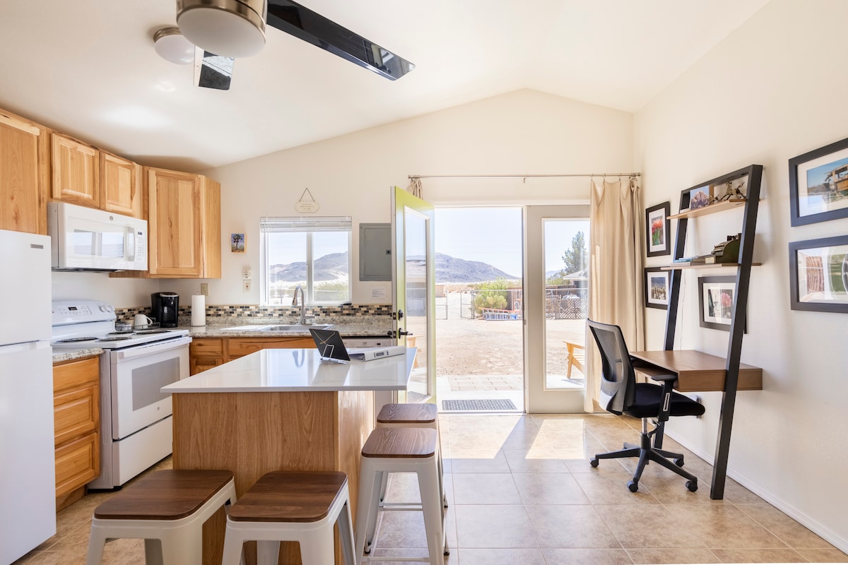 8,2 milhas de JTNP Acorde com vistas deslumbrantes das colinas do deserto iluminadas pelo sol e um pôr do sol deslumbrante. Cozinha adjacente ao quarto, com mesa de café para refeições rápidas. E grande mesa de jantar na sala de estar para jantares prolongados. Tome seu café da manhã no pátio privativo, aproveite o sol ou observe as estrelas sob o céu noturno cristalino. Após a reserva, você receberá nosso Guia do Hóspede Online, que destaca nossos lugares favoritos para comer, beber e caminhar, tornando sua estadia genuinamente inesquecível.