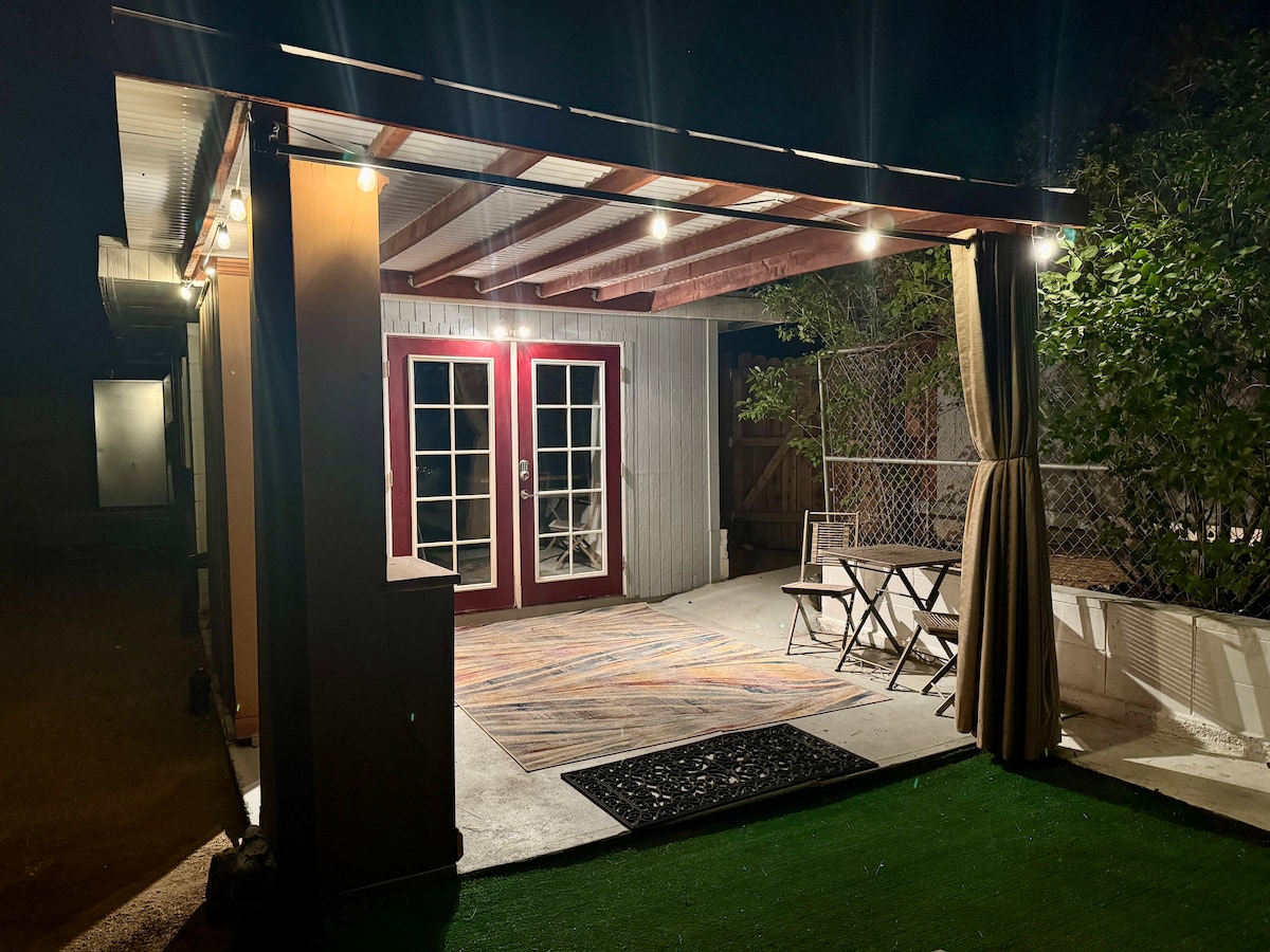 Reconecte-se com a natureza nesta casa de hóspedes onde a luz natural acentua a decoração eclética de cores inspiradas em agave e móveis de luxo. Passe um tempo no jardim com vista para as árvores de Joshua e montanhas com estrelas acima da fogueira à noite. Um maravilhoso quintal com uma fogueira (por favor, traga sua própria lenha) e sapatos de cavalo está disponível para uso, e uma entrada privativa é fornecida para os hóspedes. O espaço alugado inclui um apartamento estúdio independente com uma entrada privativa, acesso à churrasqueira do quintal, fogueira e campo de arremesso de ferradura. Este é um apartamento estúdio privado independente diretamente atrás da casa do proprietário. O proprietário estará disponível para ajudar você com qualquer problema que você possa ter durante a sua estadia. A acomodação fica em um bairro tranquilo, longe de ruas movimentadas. Restaurantes e lojas estão nas proximidades e fica a apenas 10 minutos de carro da entrada do Parque Nacional de Joshua Tree. Caminhe à tarde e desfrute de ver a Via Láctea da varanda da frente. Este local incrível está localizado a apenas 10 minutos da entrada do Parque Nacional de Joshua Tree. Há apenas um semáforo entre o local e um super Wal-Mart ou Home Depot. Uma curta viagem de 5 minutos de carro o levará ao café Crossroads para alguns hambúrgueres excelentes. Este espaço é de propriedade e mantido por um guia local de escalada; se você estiver interessado em uma aventura de escalada durante a sua estadia, por favor, informe o proprietário! O apartamento está equipado com um fogão a pellets como fonte de calor principal. Se mais de dois hóspedes desejarem ficar, há um colchão de ar adicional disponível. Uma taxa adicional de US$ 15 por pessoa por noite será feita para hóspedes adicionais (mais de 2).