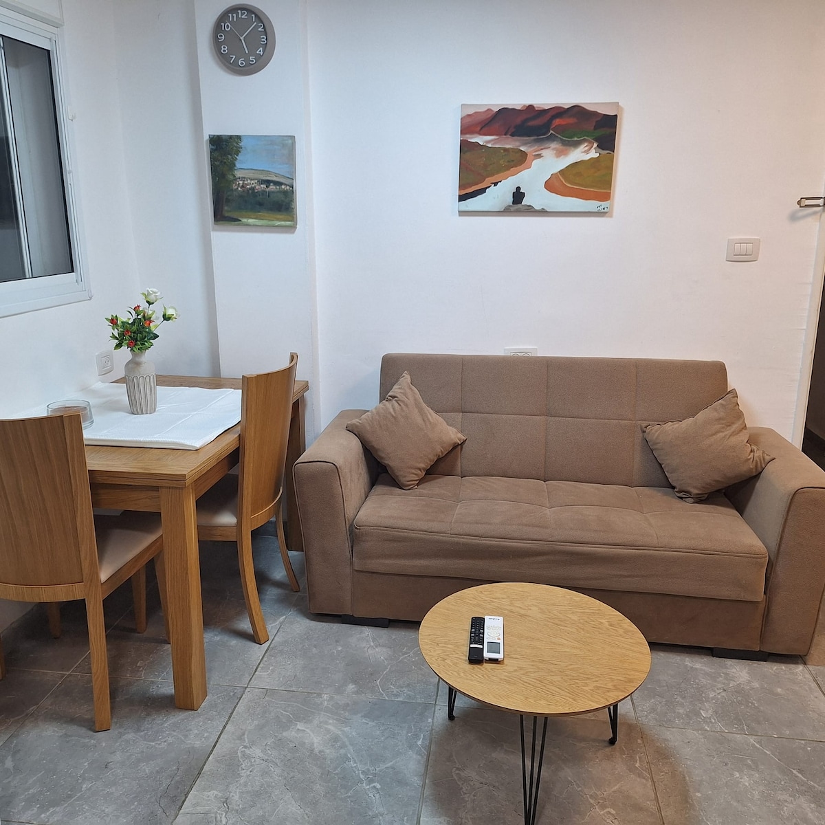 Forget your worries in this spacious and serene space. It is the upper floor of a private house with a private entrance. Very easy access from the street. Plenty of free parking. You will definitely enjoy the balcony off the living room overlooking the Galilee mountains and the northern sea shore. In the living room there is a large, 65”, TV with Netflix, Israeli channels and more. Self check in (at 3:00 pm) and checkout (at 11 am). Please let us know if you will need one or two bedrooms.