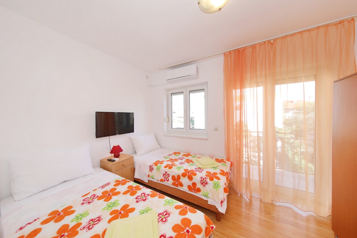 Apartamento estúdio de luxo com cozinha, banheiro, TV e ar condicionado ideal para duas pessoas. Estacionamento gratuito também incluído. Estação de ônibus, porto de Gaženica e centro da cidade ficam a 5 minutos de carro. A praia fica a 300 metros do apartamento.
