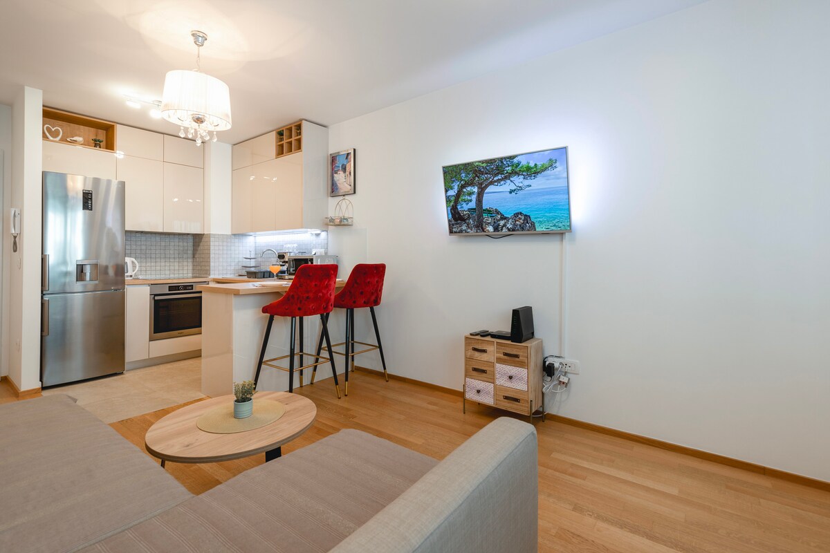 Este apartamento de um quarto terminou sua reforma em junho de 2023. É novo, moderno e totalmente equipado. Está situado no centro da cidade velha e a apenas 2-3 minutos da Praça e a 10 minutos a pé da praia. O apartamento tem 30 m² e está localizado no piso térreo de um edifício que está situado na área de estar confortável no coração da cidade. O apartamento hospeda confortavelmente até 2 pessoas. O apartamento tem ar-condicionado. Wi-Fi gratuito também é fornecido.