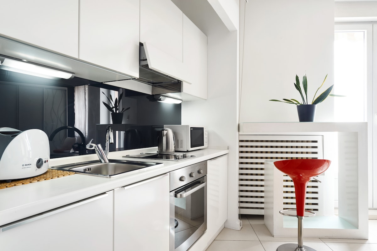 Relaxe neste espaço calmo e cheio de estilo. O apartamento foi recentemente renovado e completamente remodelado. Pensamos em cada detalhe ao criá-lo. Como um hóspede descreveu "todo o conforto de uma casa com as conveniências de um hotel". O quarto pode ser completamente escurecido. Uma cama queen extra confortável com roupa de cama de cetim branco promete um bom descanso. Um banheiro pequeno e moderno tem um chuveiro. Piso aquecido. Todas as toalhas em algodão branco para um padrão de higiene de alto nível. Sala de estar aconchegante. Aproveite😉