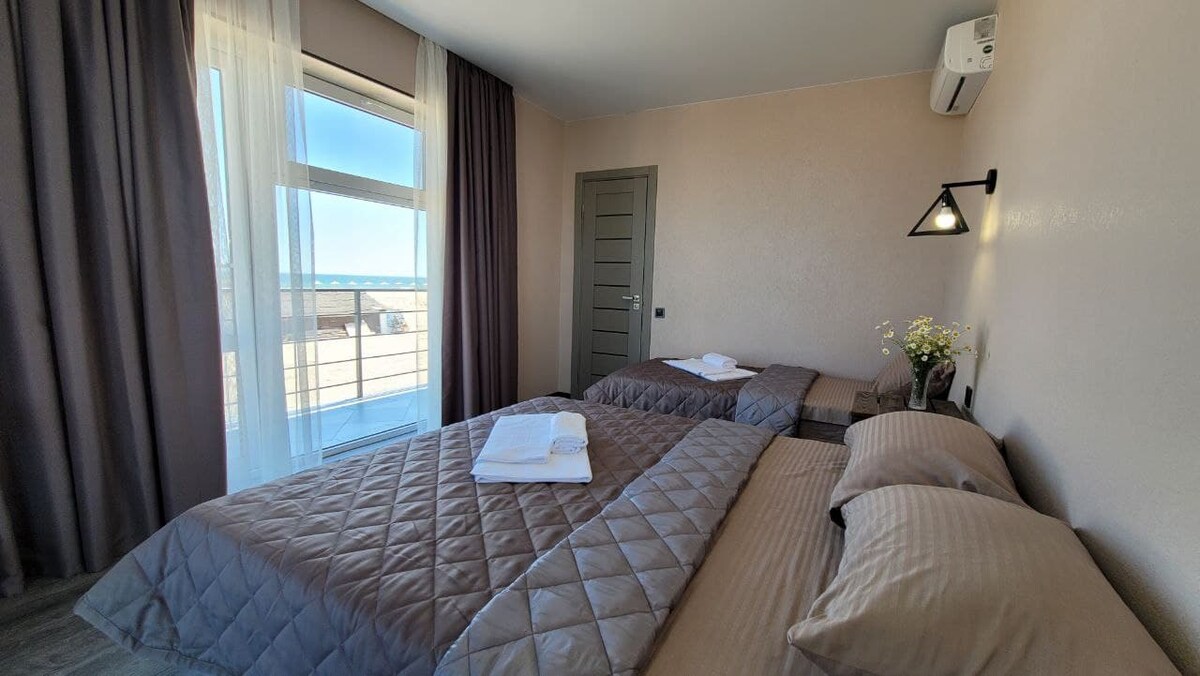 Oferecemos que você fique em nosso aconchegante apart-hotel, que fica a 100 metros do mar. O quarto tem todas as comodidades para uma estadia confortável: geladeira, TV, ar condicionado, WIFI, um banheiro privativo. No território do hotel há uma cozinha separada equipada e equipada com tudo o que você precisa para cozinhar ao ar livre. Se você vier para uma pausa de tudo, incluindo a cozinha, há muitos cafés com uma grande variedade de cozinhas na área do nosso hotel.