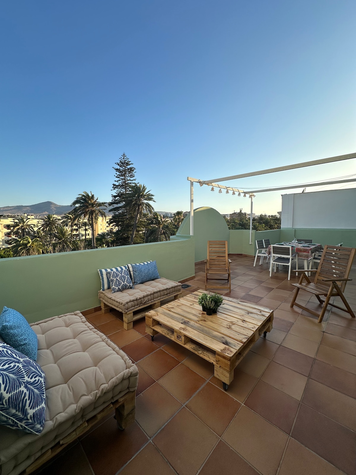 IMPRESSIONANTE e tranquila cobertura com vista para o Parque Hernandez e a emblemática Plaza de España. Localizado no coração de Melilla, excelente para descobrir e conhecer o estilo modernista de seus edifícios, os melhores cafés e restaurantes, Melilla la Vieja e a apenas 5 minutos da Praia de los Galápagos. Totalmente externo, com dois grandes terraços confortavelmente equipados. Consiste em um quarto com uma cama de 1,50 m e um sofá-cama na sala de estar de 1,35 m.