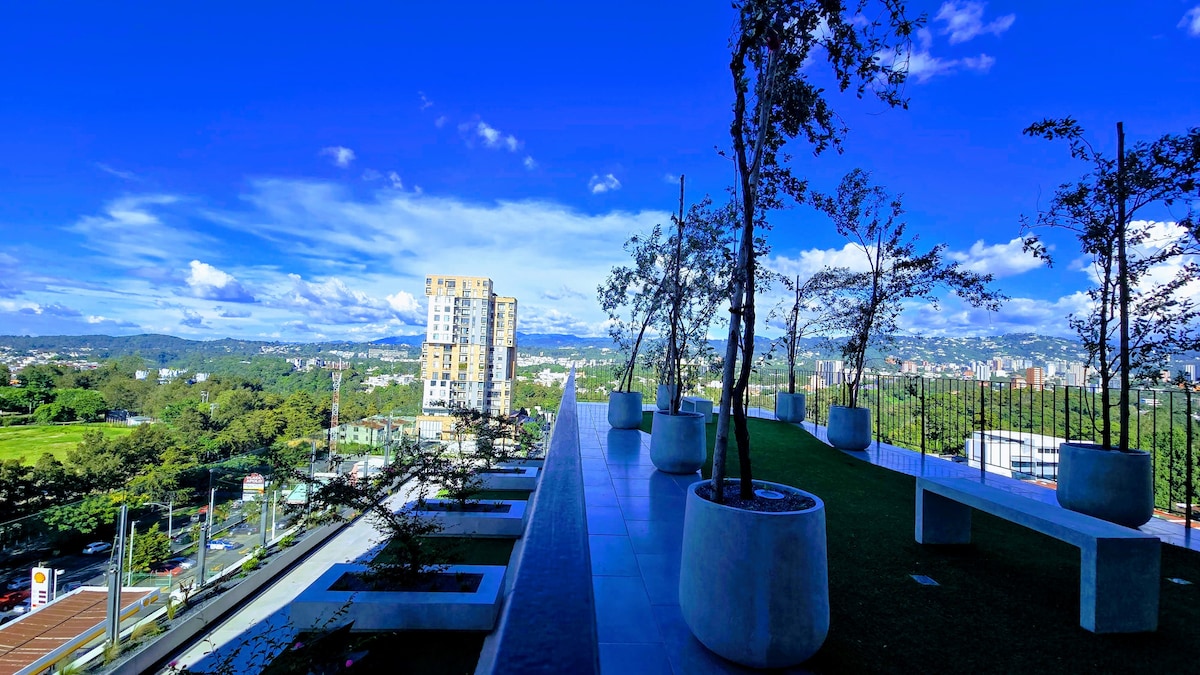 Apartamento central, privado, limpo e com vista para os vulcões na zona 10. Este apartamento tem: - Jacuzzi - Piscina - Academia - Cama ortopédica nova e da melhor qualidade - Ventilador silencioso -Cozinha equipada - Secador de cabelo - Smart TV HD e excelente velocidade de Internet. Tem estacionamento privativo, acesso a pé, vários Shoppings, Praças, cafeterias, livrarias, ciclovias e vida noturna ao redor. Localizado na área hoteleira da Cidade da Guatemala.
