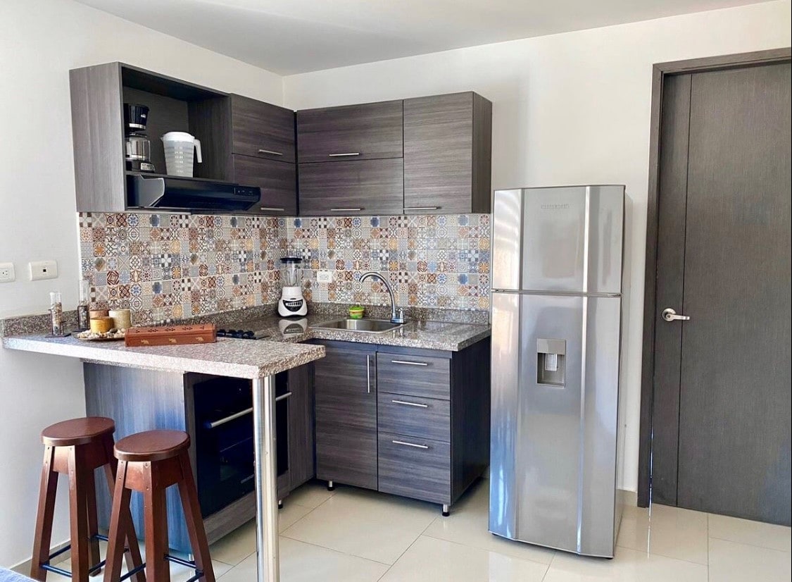 Apartamento confortável e bonito com 2 quartos, cada um com closet, banheiro privativo e AA. Quarto principal com cama de casal ninho (outra cama de casal embaixo) e o quarto secundário com 2 camas de solteiro ninho (outras 2 camas de solteiro embaixo). Cozinha totalmente equipada. Sala e estúdio com AA. Wi-Fi de alta velocidade e sinal de cabo. 3 Smart TV. Edifício com piscina e academia. Lembre-se de que você deve enviar sua documentação antes do check-in (leis colombianas).
