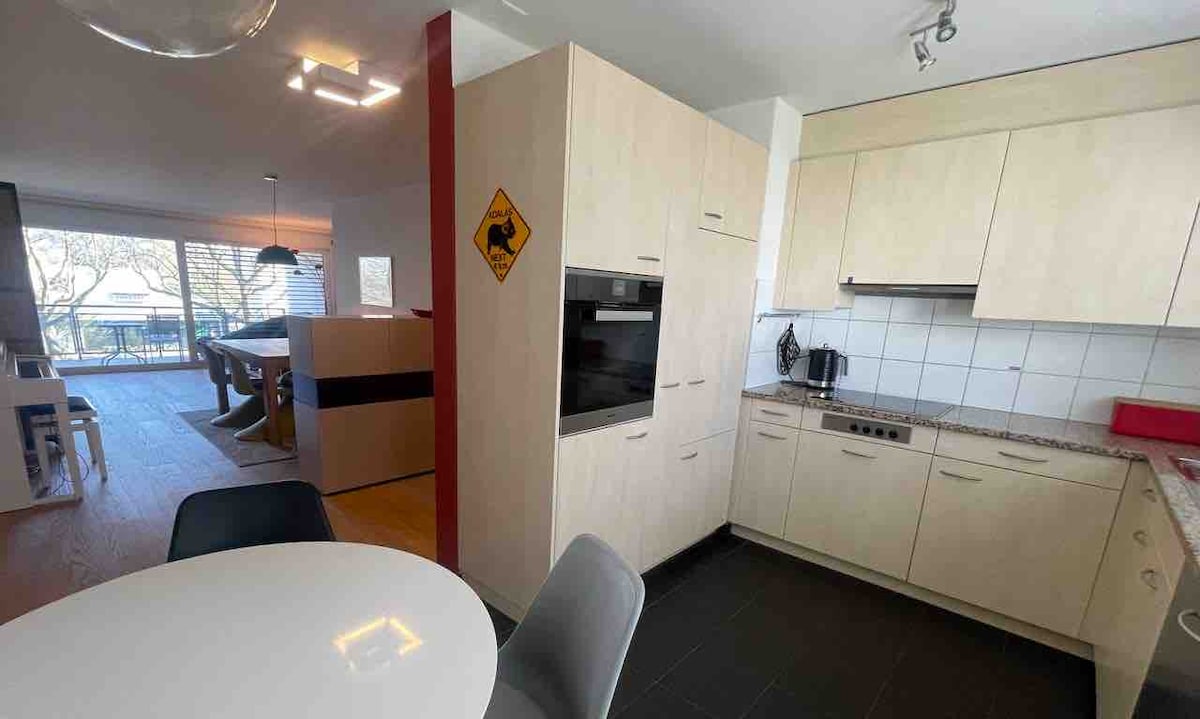 Novo apartamento espaçoso e tranquilo (115m2), com vista fantástica para o rio e para as colinas verdes. Os hóspedes têm acesso a um lugar de estacionamento privado na garagem subterrânea com caixa de parede para carregar o carro, uma cozinha de alta qualidade com forno, vaporizador, máquina de lavar louça, etc., máquina de lavar/secar roupa privada, duas casas de banho (chuveiro/wc, banheira/wc), dois quartos e um confortável espaço de escritório. O centro da cidade de Zurique fica a apenas 10 minutos de transportes públicos e também pode ser alcançado de bicicleta. Perfeito para estadias longas e famílias